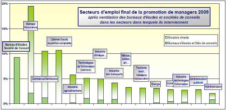 Comme vous pouvez le voir ci-dessous, les jeunes diplômés 2009 des écoles de management ont décroché majoritairement leur premier job dans le secteur de la banque et des assurances (un peu moins de 20%). Viennent après l’audit et l’expertise comptable à hauteur d’environ 11%, le commerce et la distribution (10,5%) puis le conseil (9%). Ensuite, l’éventail des secteurs est assez large et équilibré. Les secteurs de l’industrie agroalimentaire, des services en technologies de l’information, de l’industrie chimique, des transports représentent chacun entre 4 et 5% environ des diplômés.